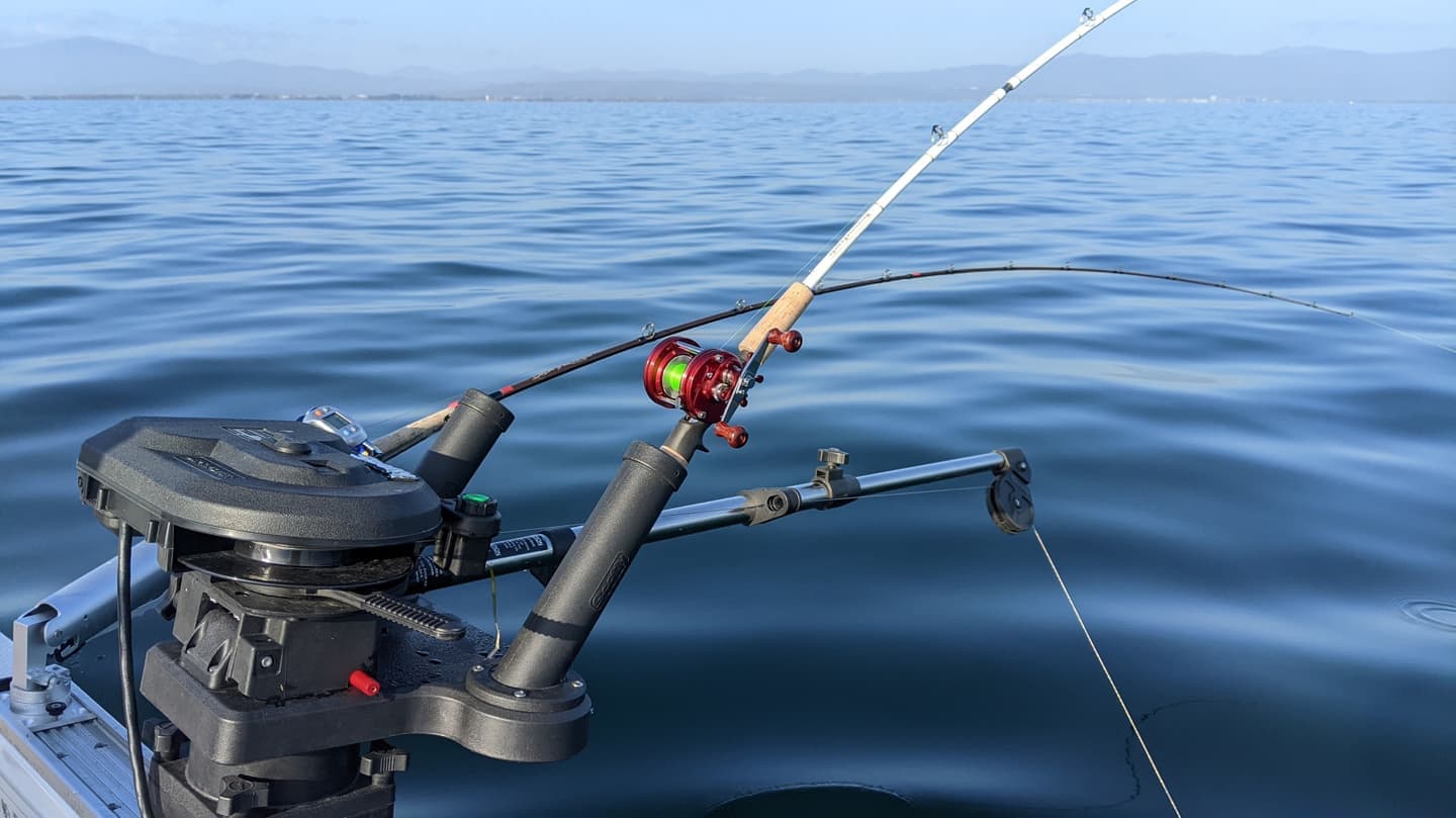 深い棚(水深)にいるビワマスを狙うのに必要なのがダウンリガー装置です。 大きな錘を一定の棚(水深)に入れてルアーを流すことができます。